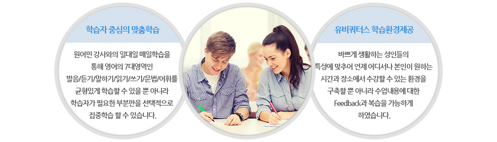 원어민과의 일대일 수업은 외국인에 대한 두려움을 없애주며 영어사용에 대한 자신감을 심어줍니다. 특히 원어민과의 일대일 수업은 학습자의 적극적인 참여없이는 진행자체가 불가능하기 때문에 능동적인 수업참여를 통해 자신감이 크게 향상됩니다.
