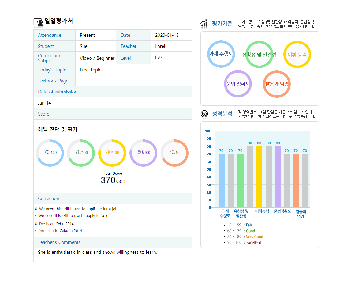 학습평가서를 통해 반복되는 체크와 자신의 문제점에 좀 더 신경을 쓰고 수업에 임할 수 있습니다.